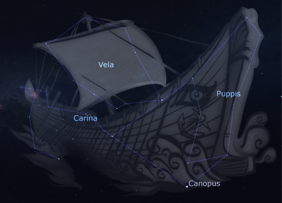 In antiquity, this was a single giant constellation, but modern astronomers have divided it up into more manageable pieces. The brightest star Canopus – the second brightest star in the night sky – marks the rudder of the great ship.