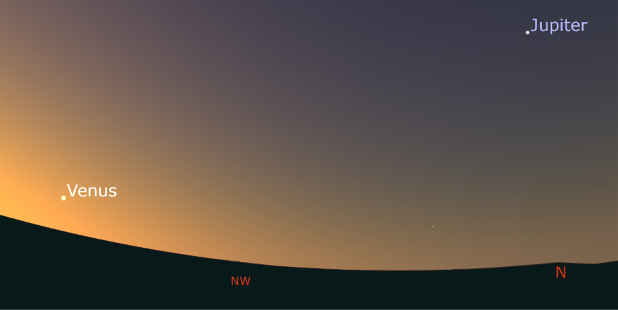 Jupiter is still hanging around in the north after sunset. Over the night it makes its way across the northwest and sets around midnight.