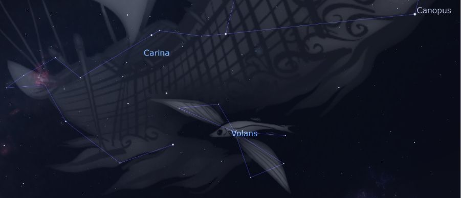 Volans is a small, faint constellation in the southern sky and is located just underneath the bow of Argo Navis, formed by Carina. There is a general theme of water to many of the constellations around this part of the sky and Volans is no exception, being interpreted as a flying fish.