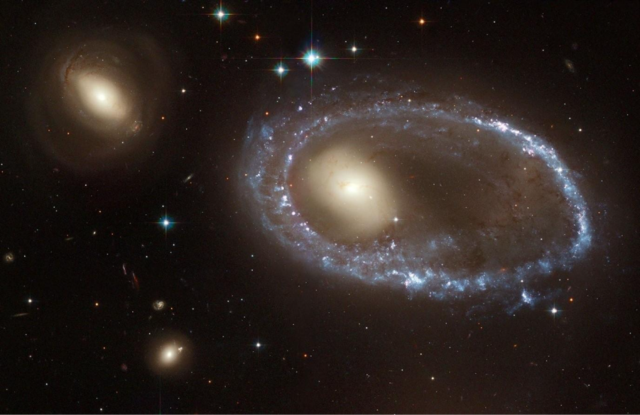 Ring galaxies form during collisions between galaxies, specifically when a colliding galaxy hits ‘face on with’ and passed through another galaxy. This causes a shockwave of hot gas to rush out from the galaxy that was struck, where it collides with material at the edge. These collisions compress the gas, causing a burst of star formation in the ring shape seen above. In galaxy AM 0644-741 the ring of newly formed stars is about 150,000 light years across, larger than the entire Milky Way galaxy, and is expected to continue to expand for a few hundred million more years before disintegrating.