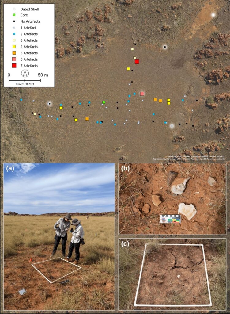 Fragments of ancient stone and shell were found exposed across the basin. Each tool fragment discovery was marked with a small square.