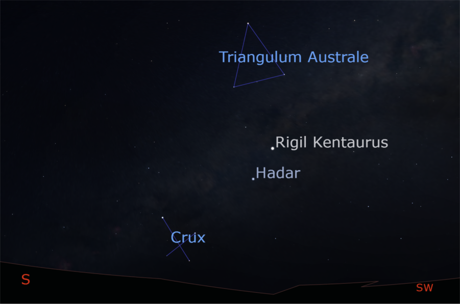 Being so far south, the constellation is circumpolar, meaning that it never goes below the horizon as seen from Perth so is visible all night, every night of the year. During October evenings you can find it in the south-southwest, just above the pointers.