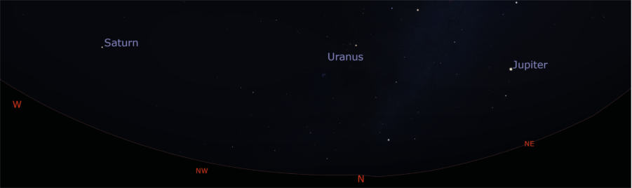 Saturn is visible in the eastern sky after sunset and ambles across the sky over the course of the night. Jupiter is rising at about 2am so is best viewed in the northeastern sky before sunrise.