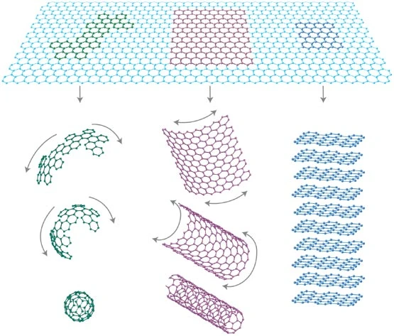 Stacking layers of graphene together, like honeycomb layers in a beehive, creates graphite.