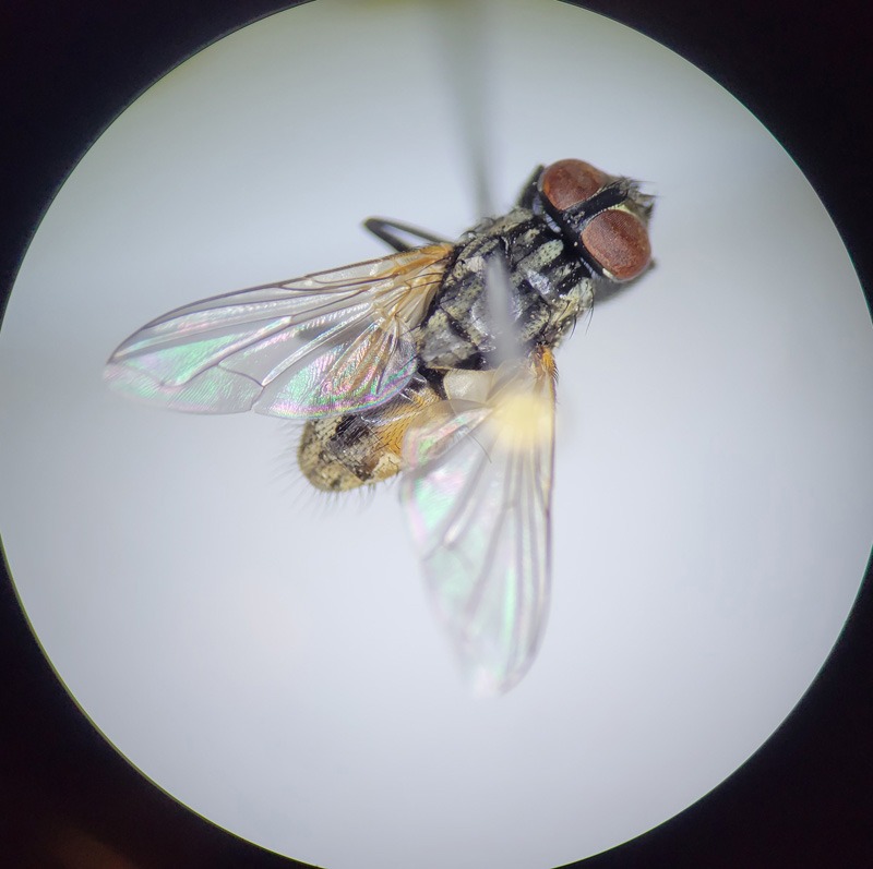 At 10x magnification, the intricate pattern of a fly’s compound eyes is in focus. At 100x, the hairs upon its pearlescent wings. At 400x, the bacteria coating its proboscis (sucking mouthpart) are visible.